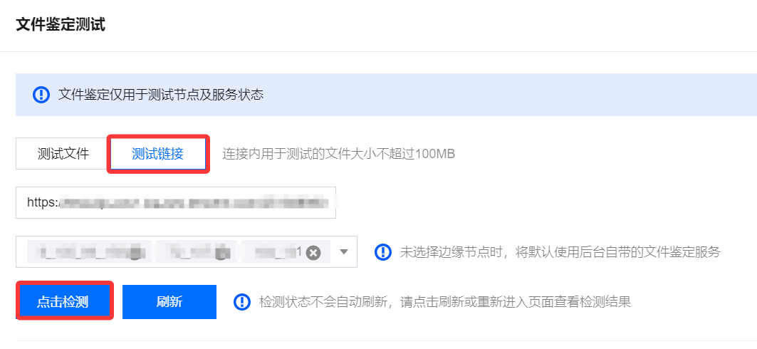 3.2 测试链接:填写需要鉴定文件的链接后单击检测,检测连通状态。
