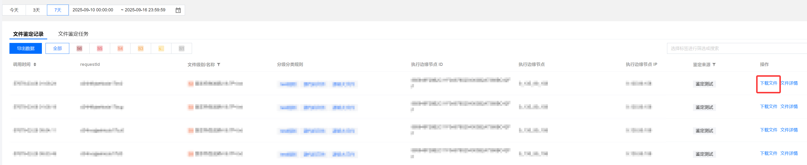 2. 在文件鉴定页面,选择文件鉴定记录,单击下载文件,可将用户提交的、已完成鉴定的原始文件下载至管理员本地设备(若管理员无权限,则在下载文件时提示失败)。