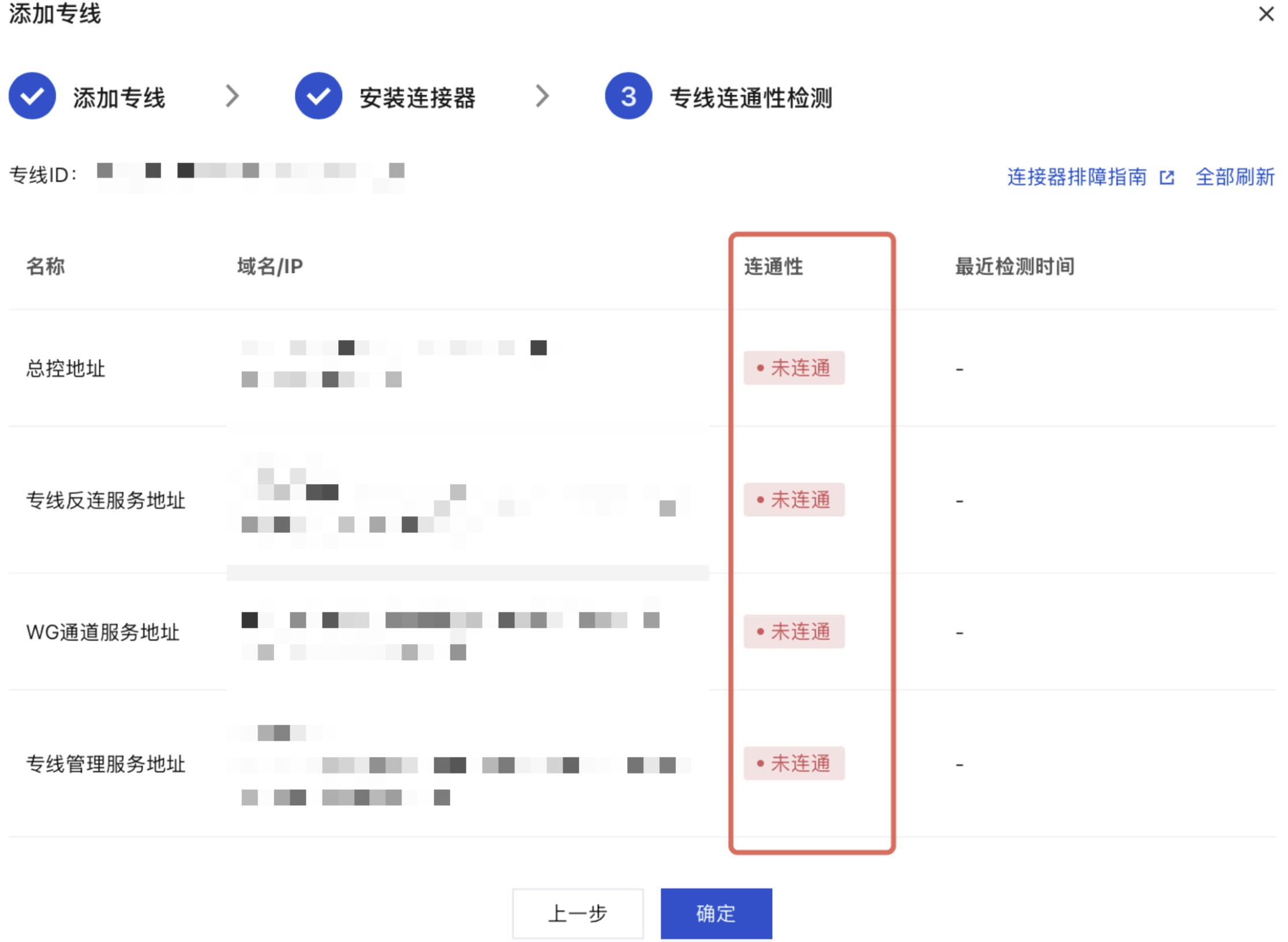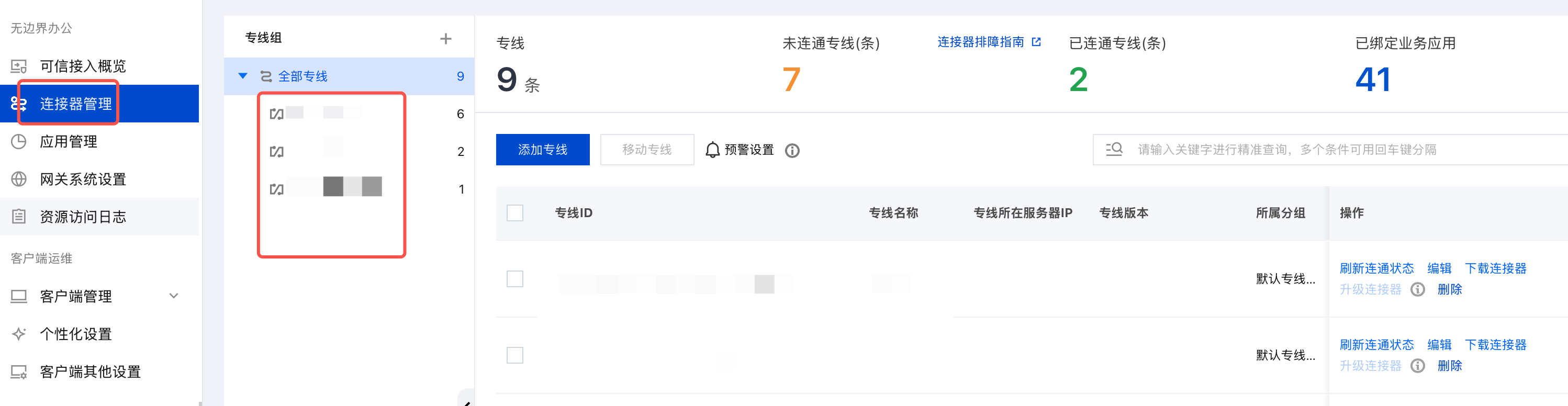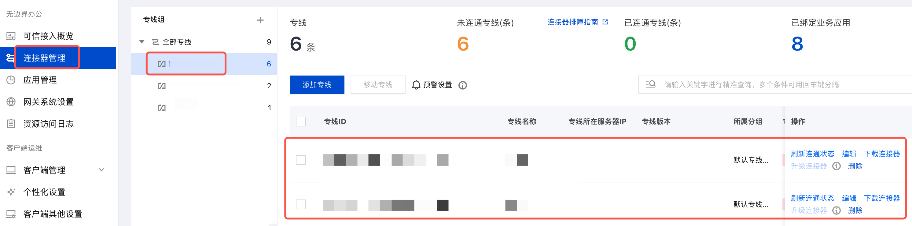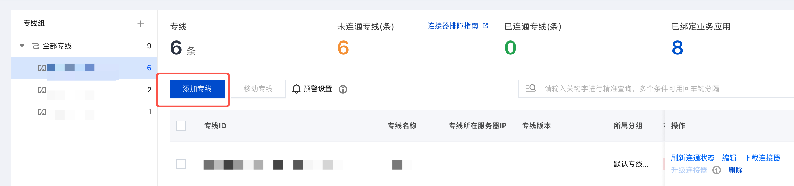 1. 在连接器管理页面,选择刚刚创建的分组,单击添加专线。