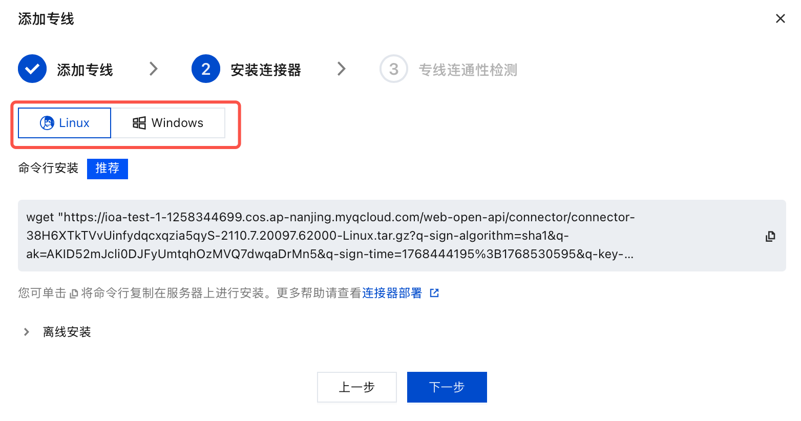 3. 根据实际需求,单击 Windows 或 Linux,复制命令下载连接器。