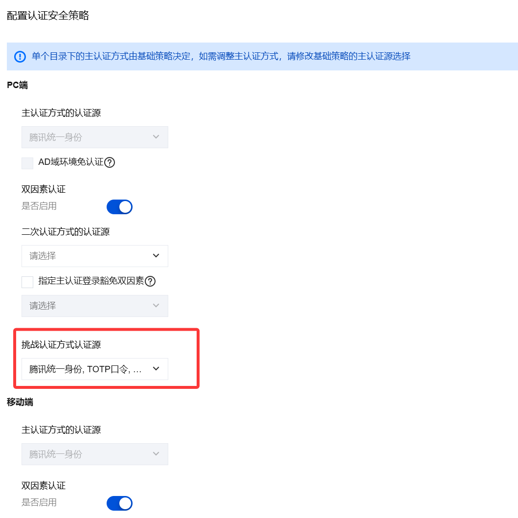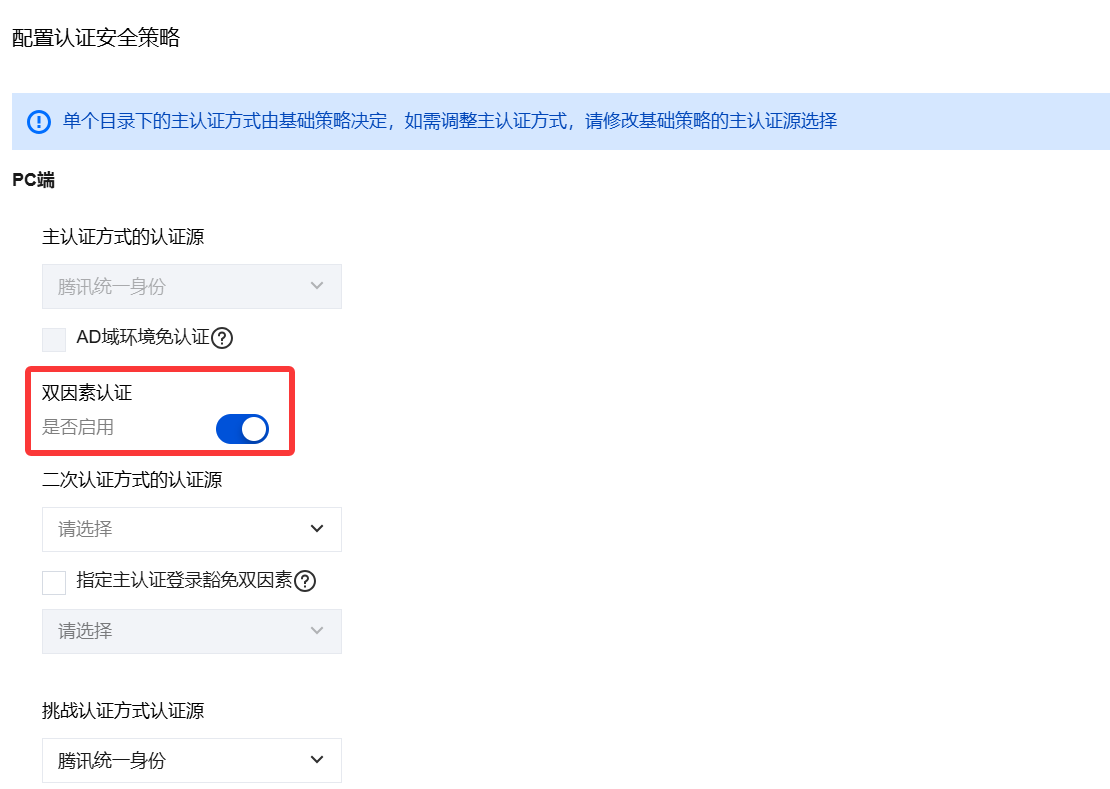 1. 前往身份安全管控 > 认证策略 页面,在对应目录的认证策略中启用挑战认证。