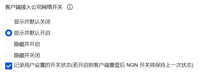 3. 应用场景说明:管理员按需设置是否记录用户设置的开关状态:若为了避免用户开启 NGN 后不关闭导致长期占用并发,可以设置开关策略为显示并默认关闭+不勾选记录用户设置的开关状态;若优先考虑用户体验,为避免用户每次手动调整开关状态,则可以设置为显示并默认关闭+勾选记录用户设置的开关状态。