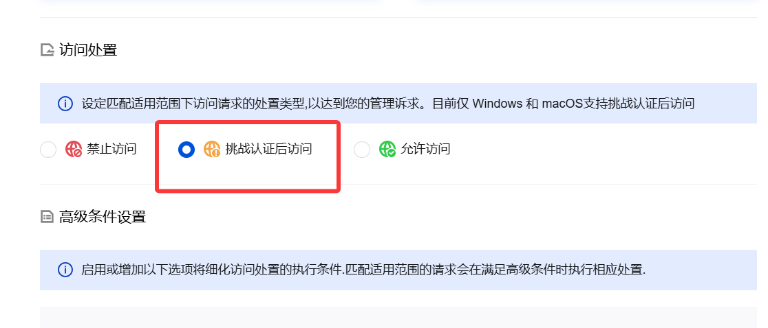 挑战认证是指当用户在特定条件下(时间、网络位置、发起访问的程序等)访问接入 iOA 的业务时,需再次进行登录认证,实现挑战认证需要进行如下配置: