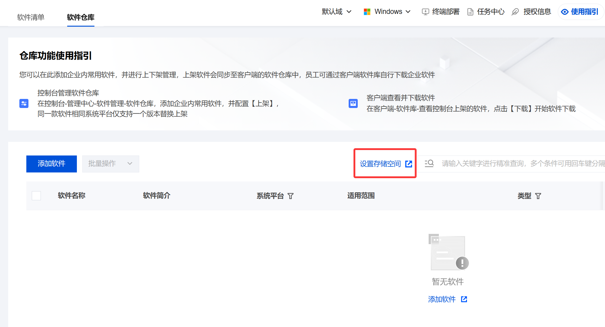 在资产管理模块中,软件管控 > 软件列表 > 软件仓库 与 软件管控 > 分发管控功能均需配置存储空间,二者的存储空间配置方式完全一致,基于这一共性特征,为提升内容的简洁性与可读性,本文将对该存储空间的配置方式进行统一阐述。