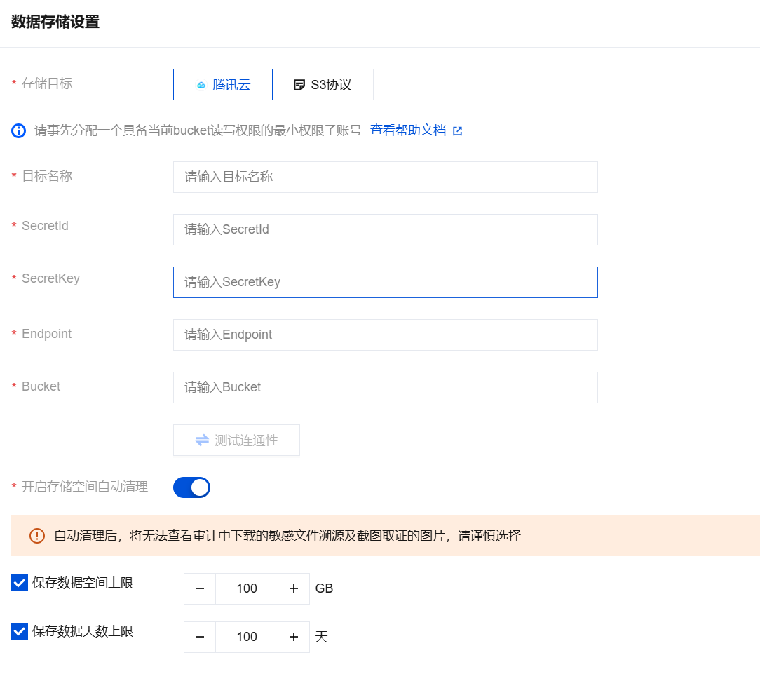 3. 在数据存储设置页面,选择存储目标,获取配置参数请参考 配置腾讯云存储服务 和 配置 S3协议存储服务。
