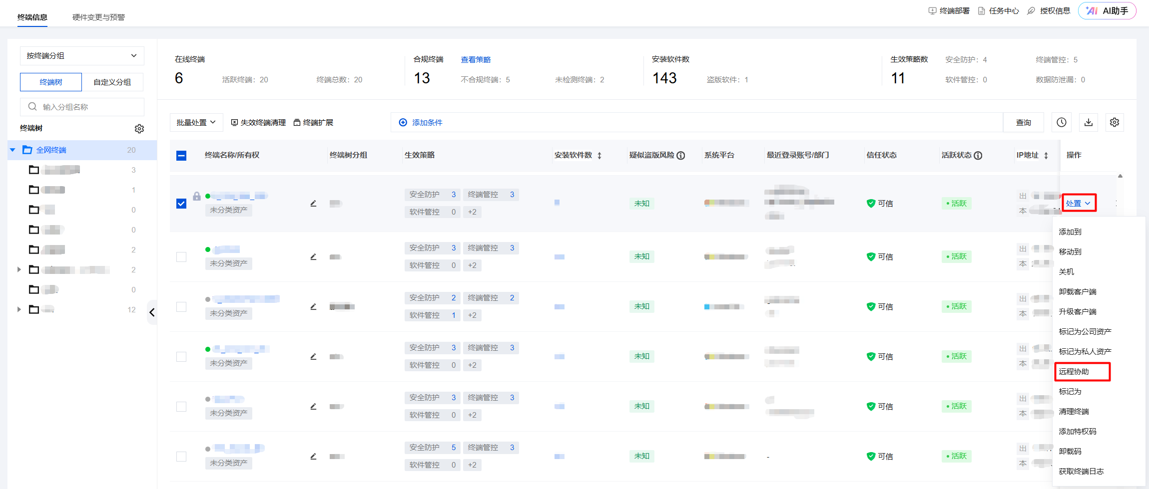 6. 您也可通过终端列表“处置”菜单栏单击远程协助,方便您快速发起远程协助操作,提升运维效率。