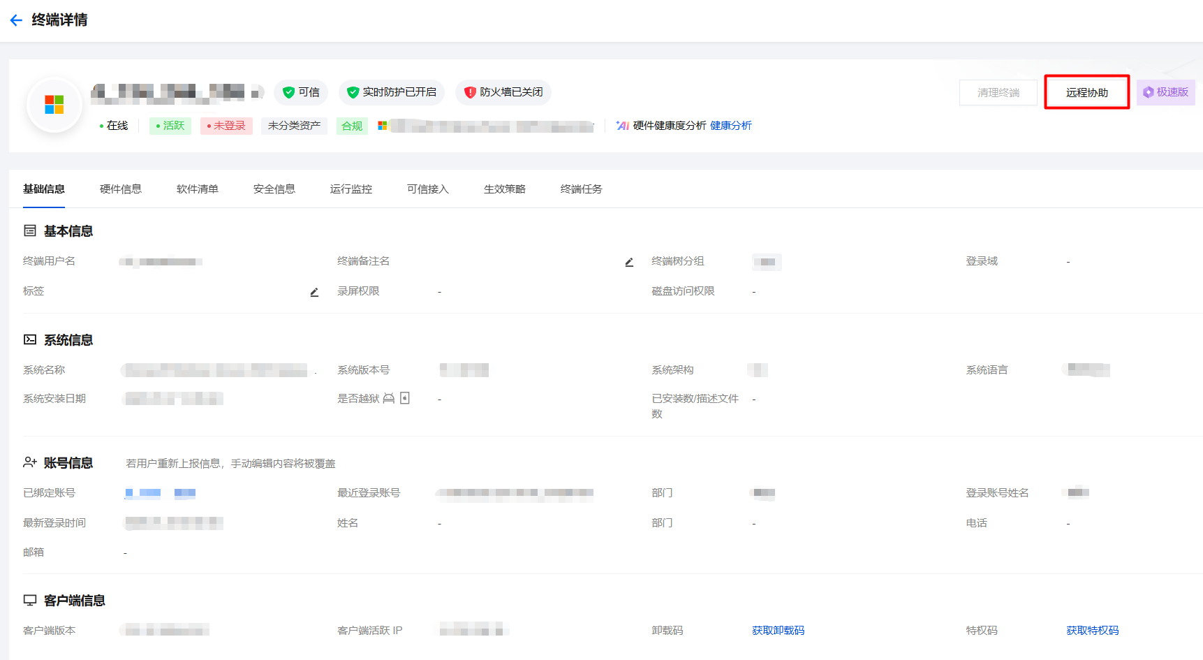 5. 在终端详情页面,单击远程协助。