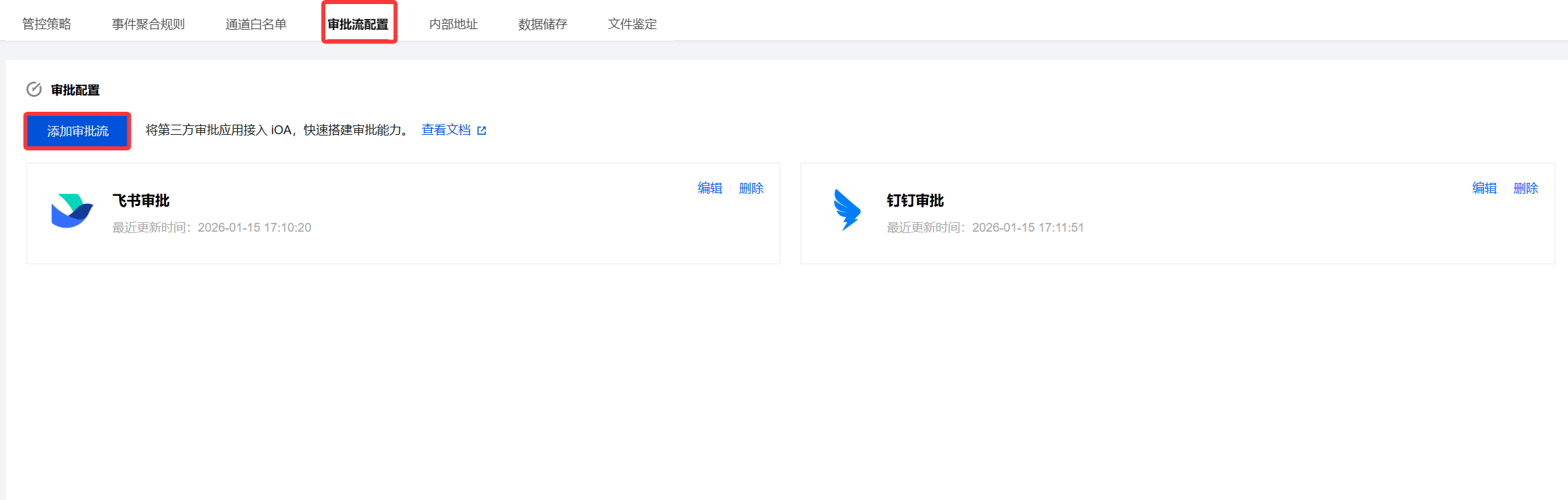 1. 登录 iOA 零信任管理平台控制台,在左侧导航栏,选择管控策略 > 审批流配置。