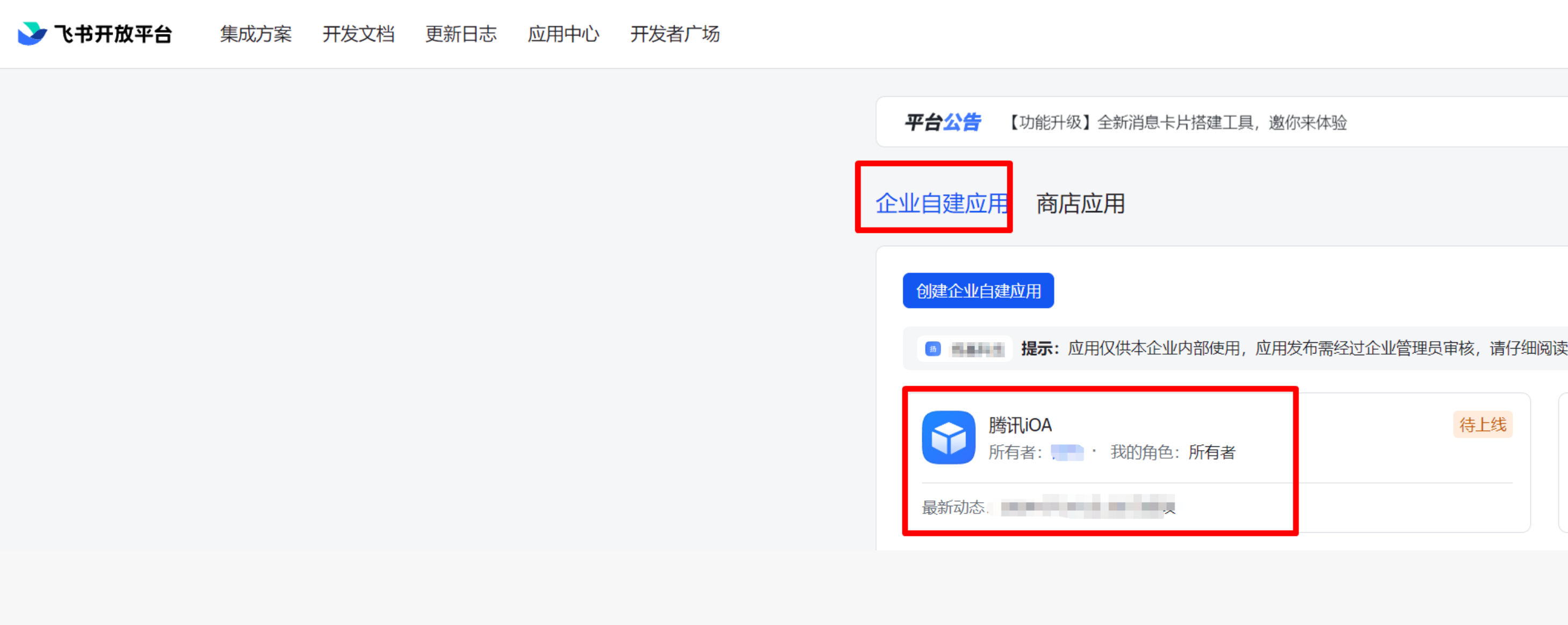 4.2.1.1 未创建企业自建应用,需要创建一个企业自建应用,登录 飞书开放平台,选择企业自建应用,单击创建企业自建应用。