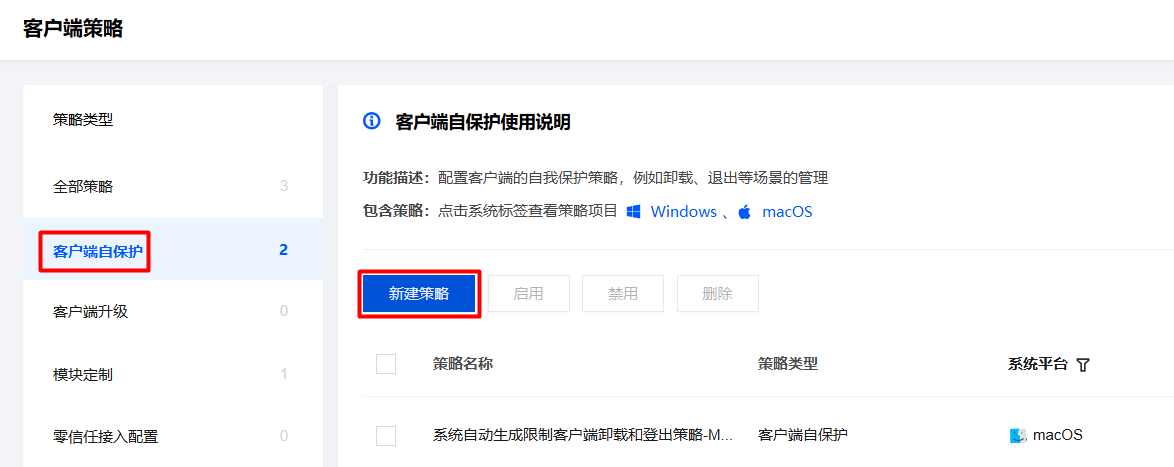 2. 在客户端管理页面,选择客户端自保护,单击新建策略。