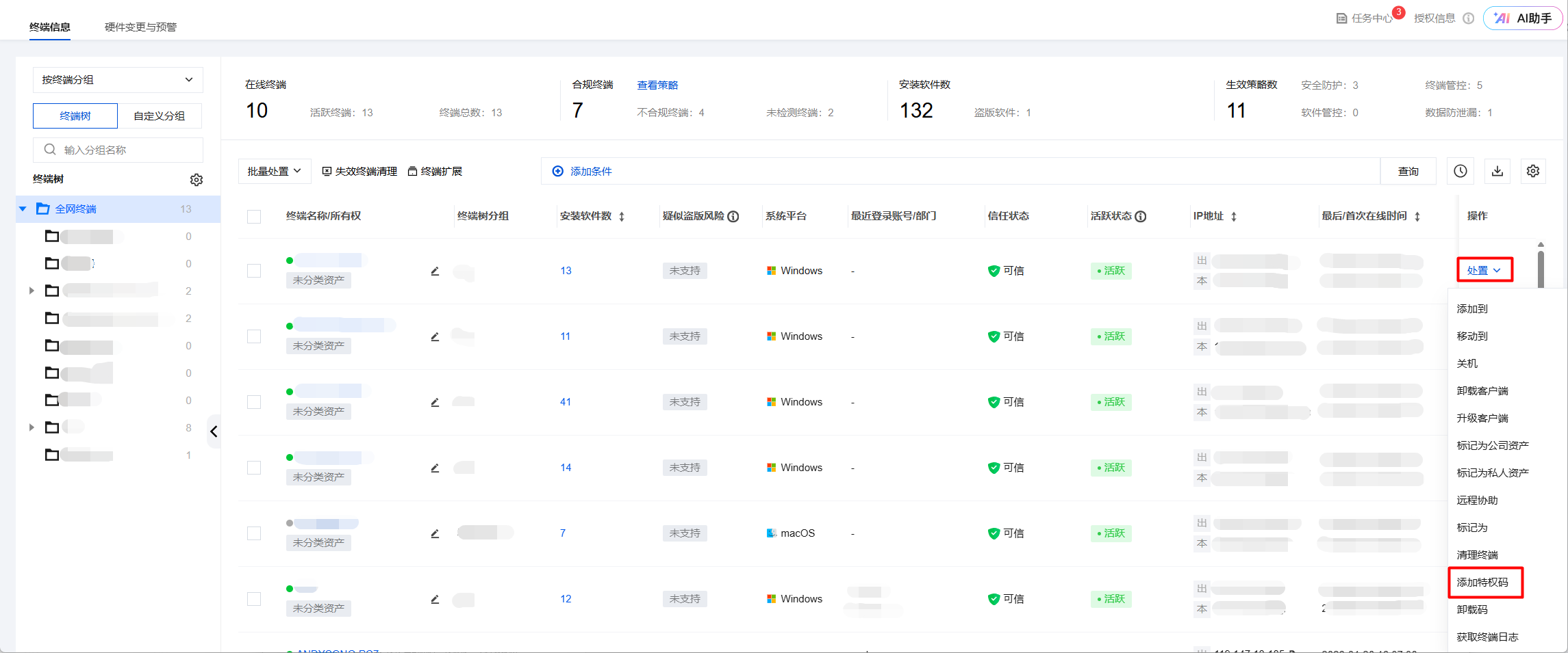 2. 前往资产运维 > 终端运维 > 终端信息,选择目标计算机,单击处置 > 添加特权码,获得特权码。
