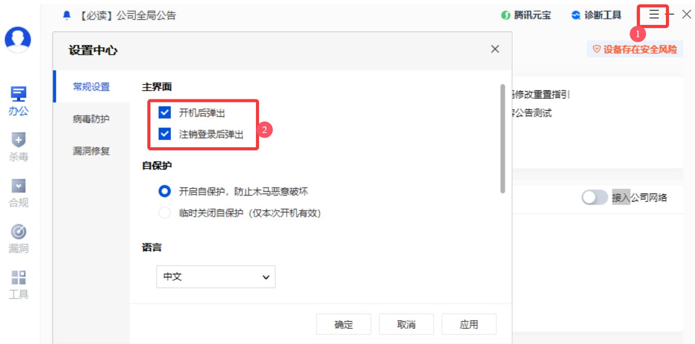 勾选允许客户端修改设置:前往客户端设置 > 常规设置,客户端支持修改主界面配置,支持设置为终端开机后弹出和客户端注销后弹出。