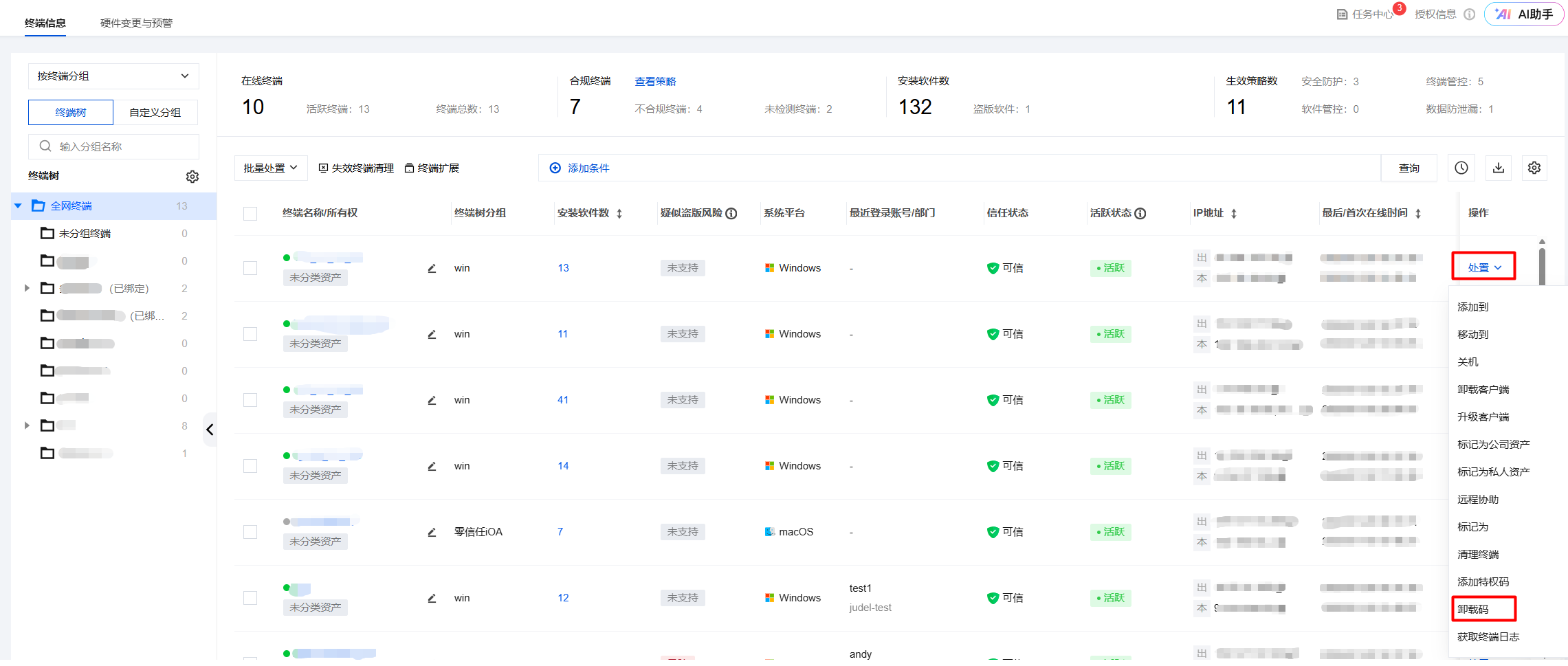 3. 前往资产运维 > 终端运维 > 终端信息,选择目标计算机,单击处置,获得卸载码。