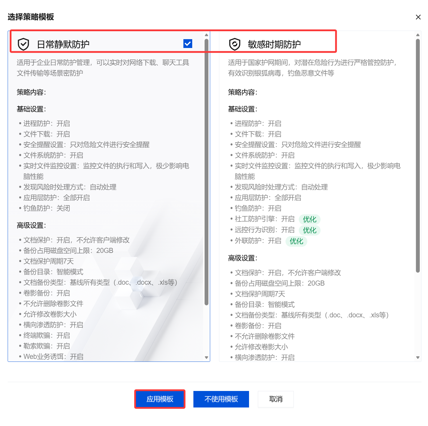 2. 勾选日常静默防护或敏感时期防护,单击应用模板。