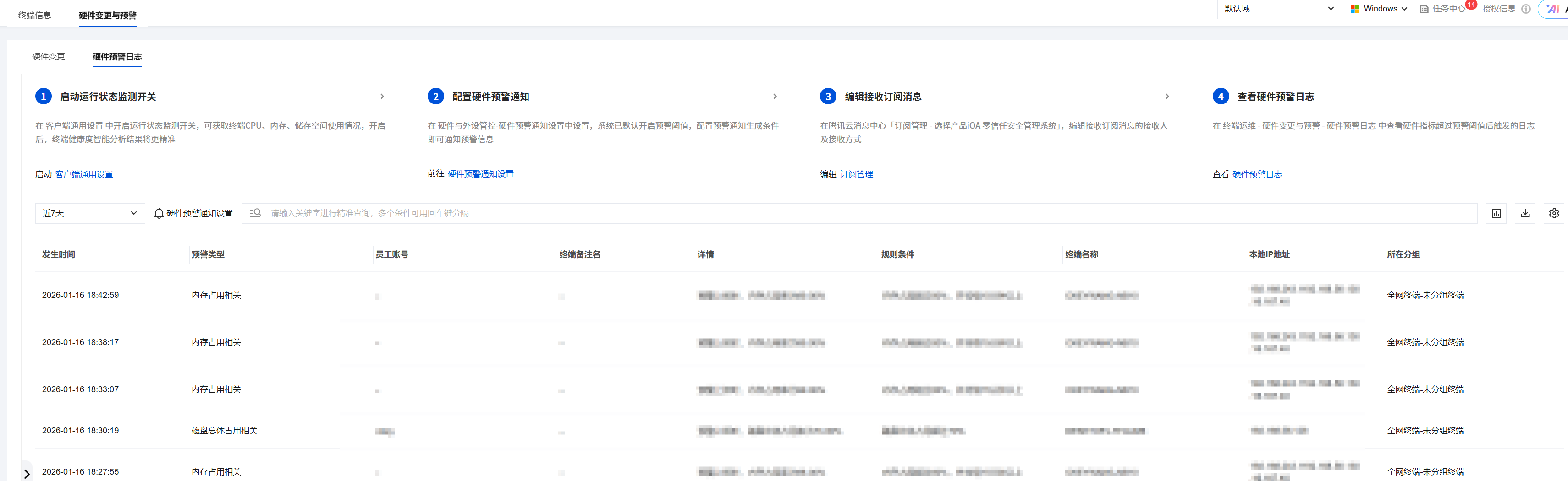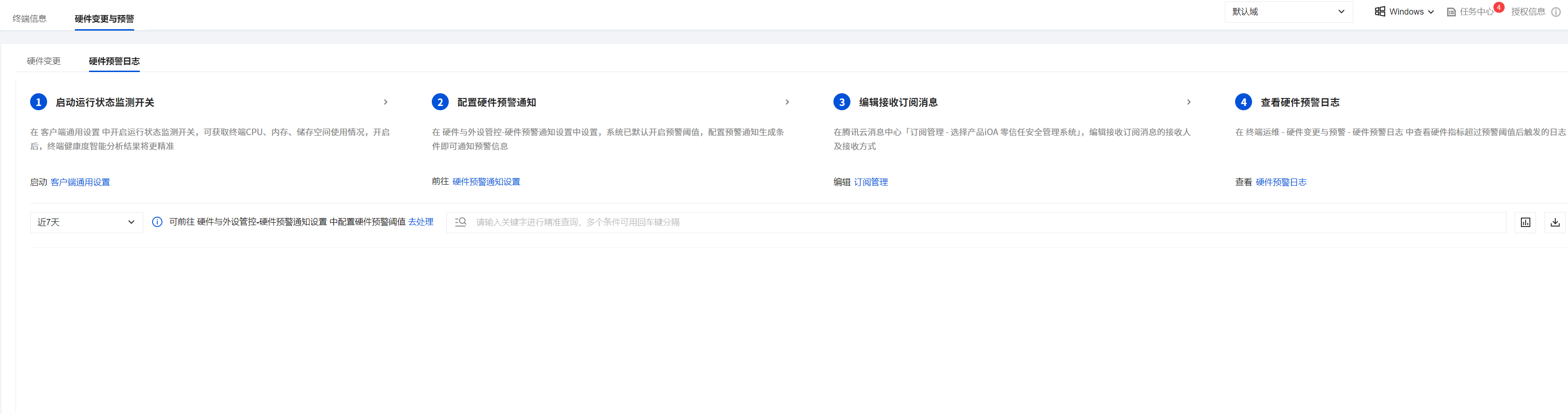 2. 在终端运维页面,选择硬件变更与预警,单击硬件预警日志。
