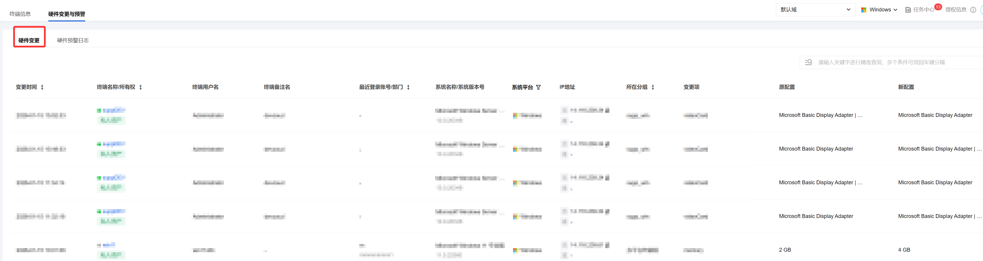 3. 硬件变更页面是硬件资产的“审计日志”。它记录并展示了终端设备上发生的所有物理硬件变更记录,例如硬盘、内存、网卡等组件的更换。