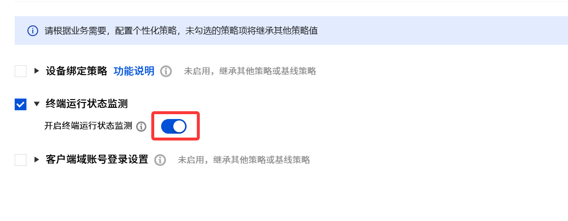 4. 在客户端管理 > 客户端策略 > 客户端通用设置中启动终端运行状态监测开关。