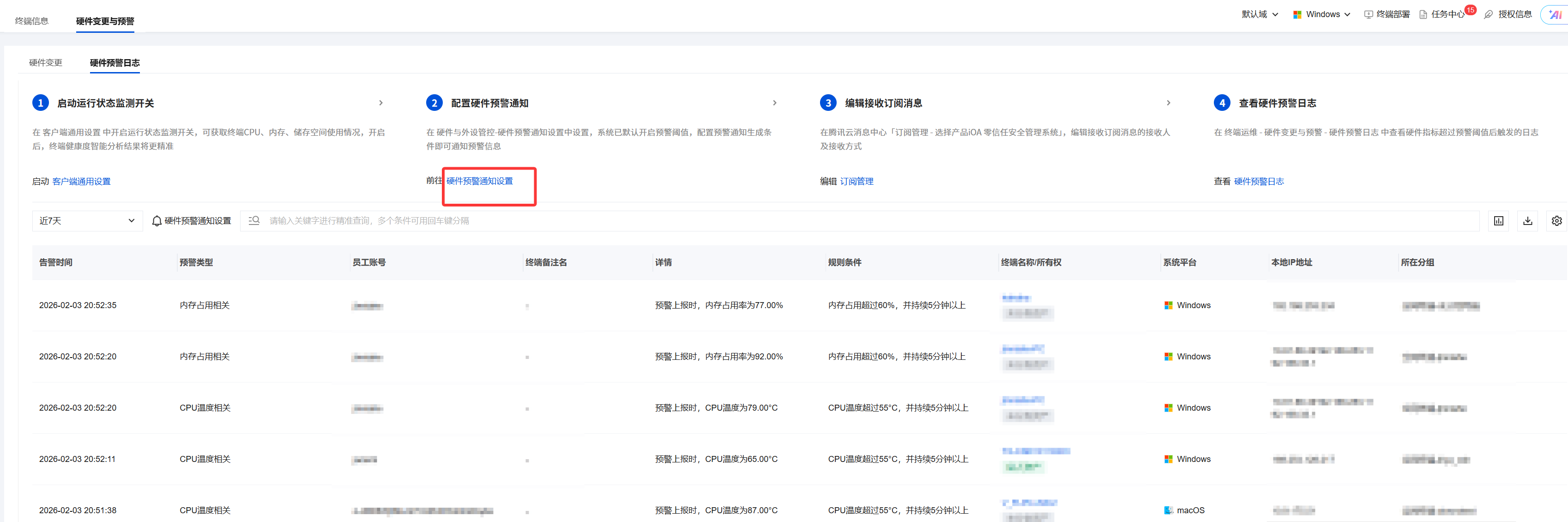 5. 在资产运维 > 终端运维 > 硬件变更与预警 > 硬件预警日志中单击硬件预警通知设置