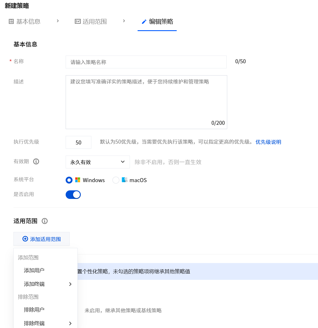 3.1 输入策略名称,并输入策略描述等参数。