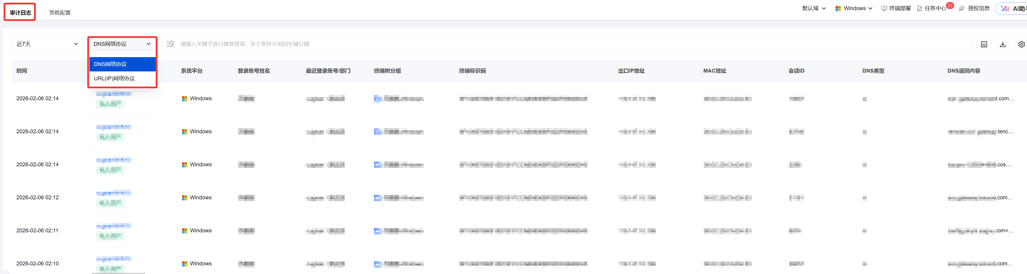3. 支持筛选查看 DNS 网络协议与 URL(IP))网络协议,在信息采集 > 策略配置中审计的网络协议,在此展示。