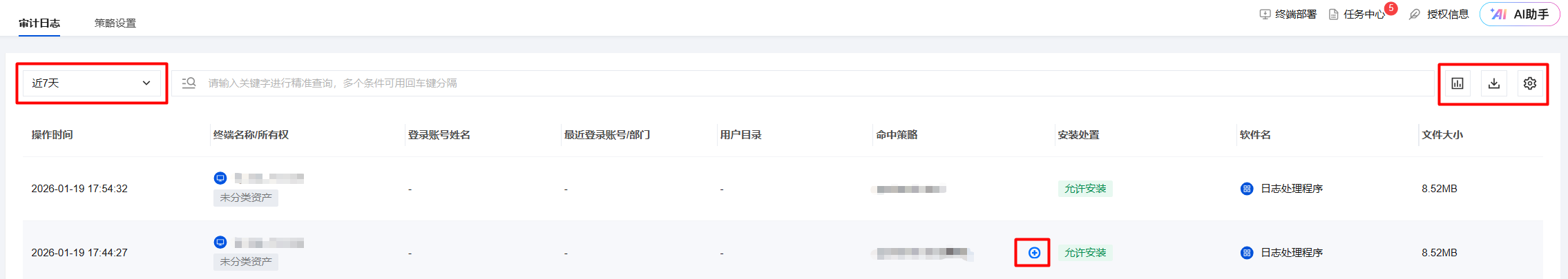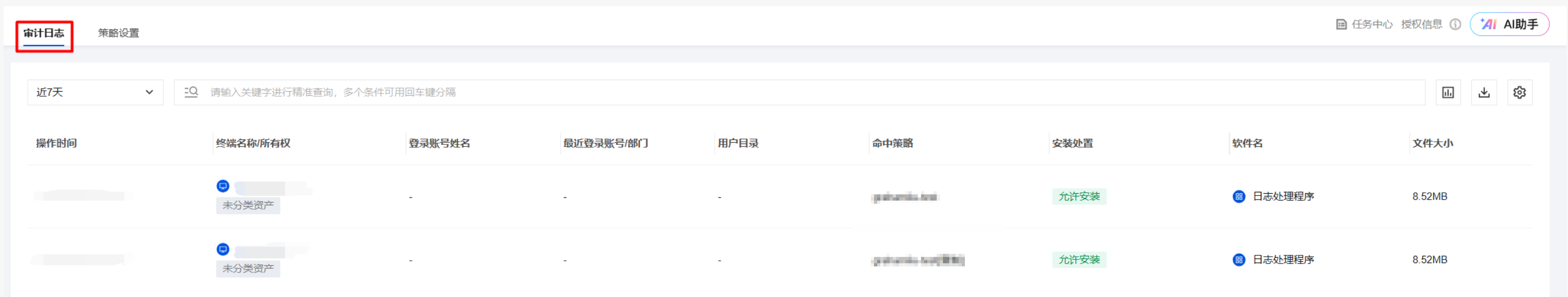 1. 登录iOA 零信任管理平台控制台,在左侧导航栏,选择安装管控 > 审计日志。