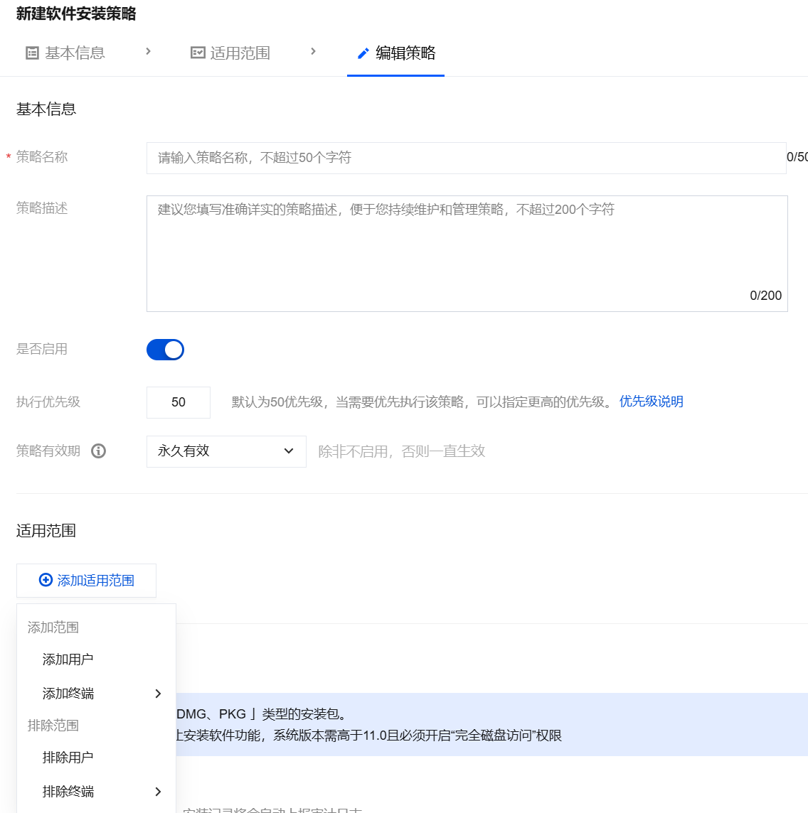 自定义软件 | 软件名称:自定义。 操作系统:勾选 Windows/macOS,勾选后可配置禁装软件参数。 ![]() |