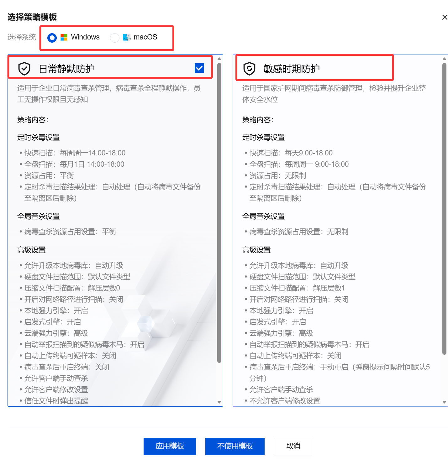 2. 根据需求,勾选 Windows 或 macOS,以及选择日常静默防护或敏感时期防护,单击应用模板。