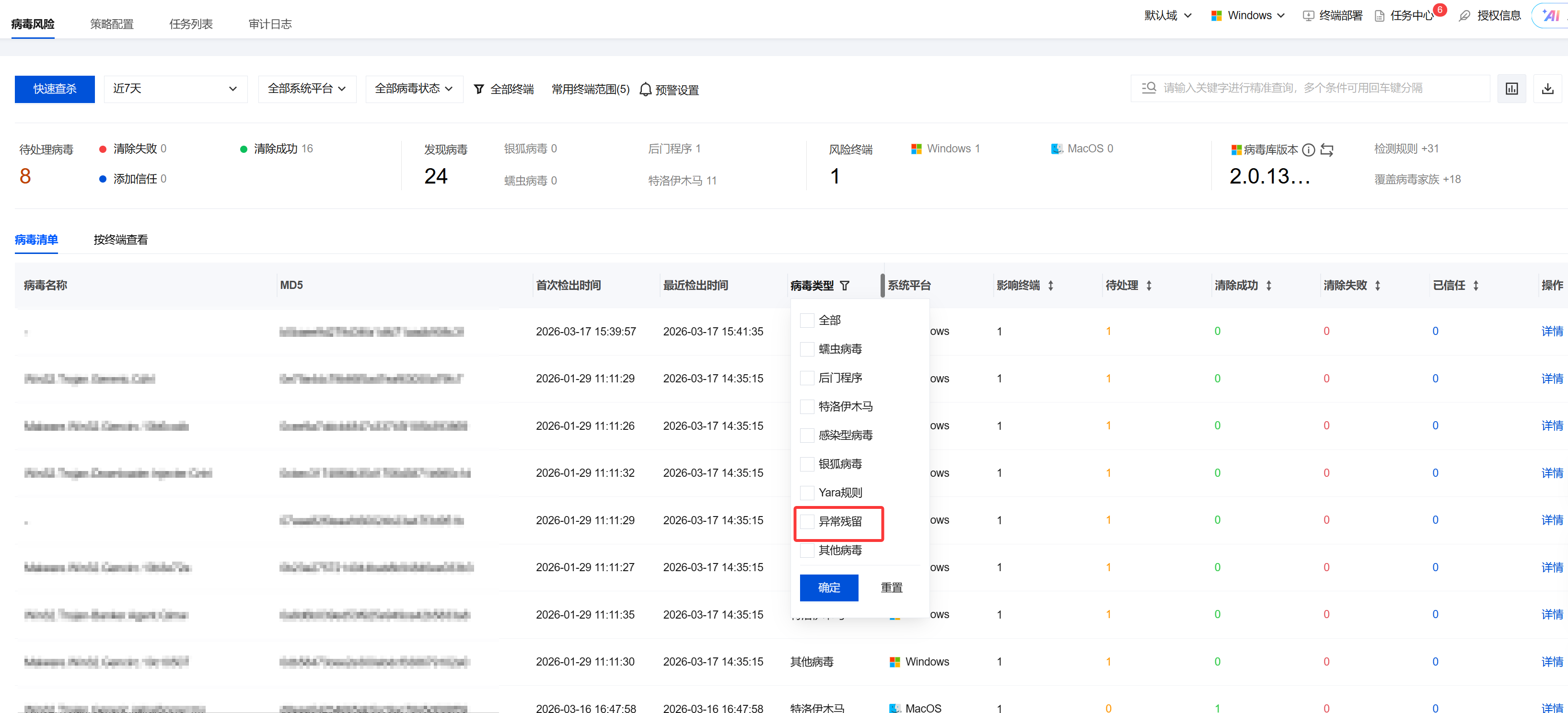 病毒清单支持展示系统修复内容,支持按病毒类型过滤,支持查看异常残留,快速定位特定类别威胁。