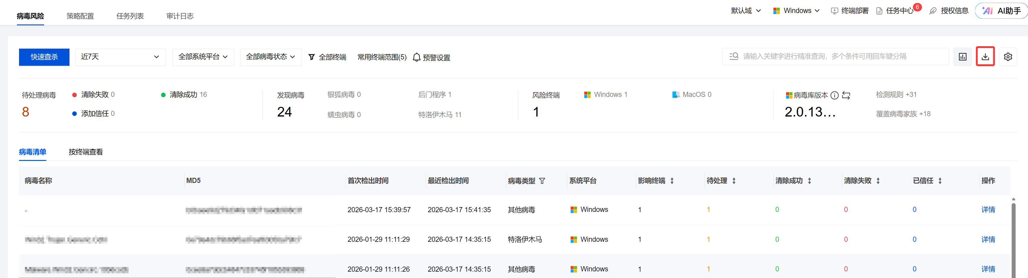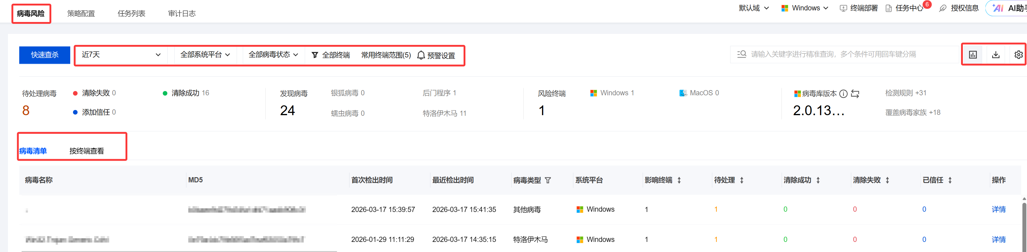 2. 在病毒风险页面,展示扫描到的病毒风险详情,支持数据筛选及统计: