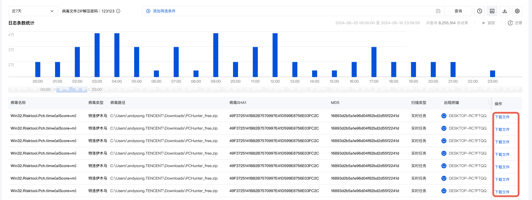 在审计日志页面,展示所有病毒查杀日志情况,支持按时间以及各字段属性筛选。