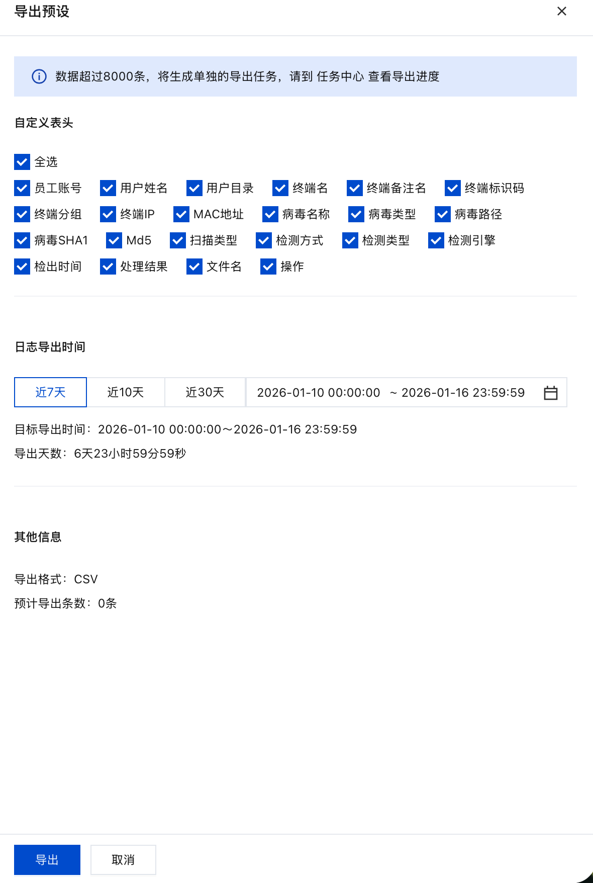 ,勾选自定义表头、导出时间参数,单击