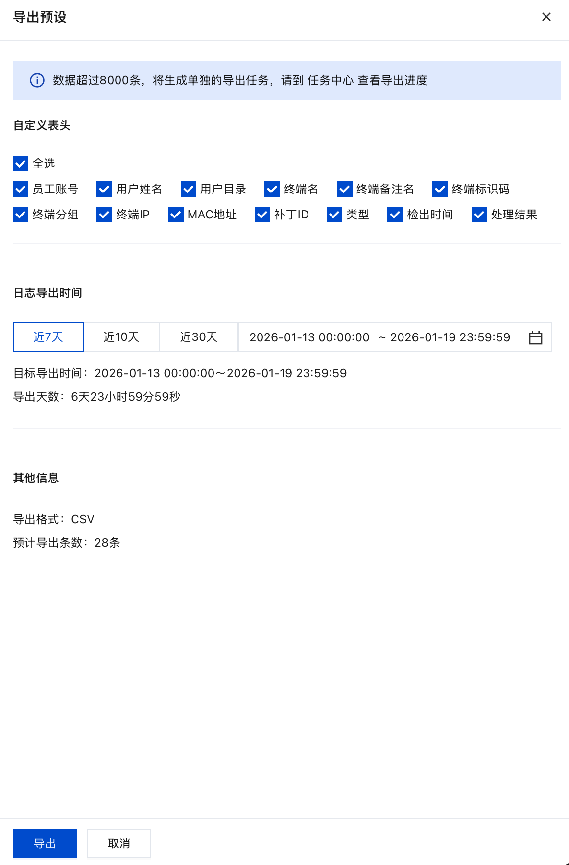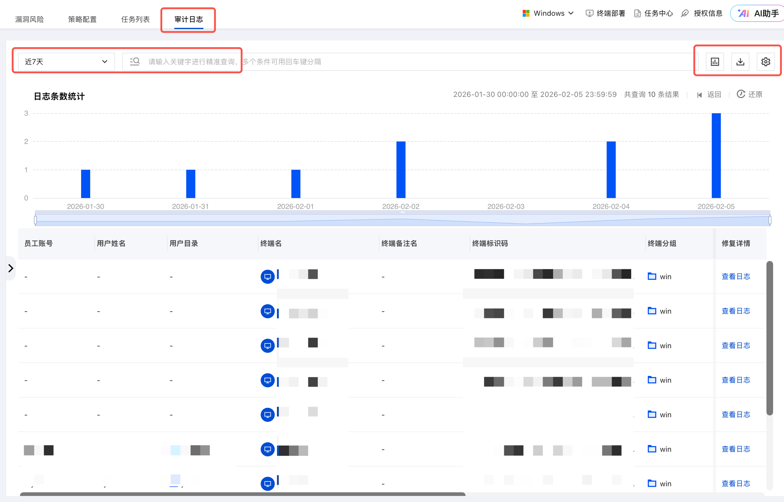 在审计日志页面,展示所有漏洞修复日志情况,支持按时间以及各字段属性筛选。