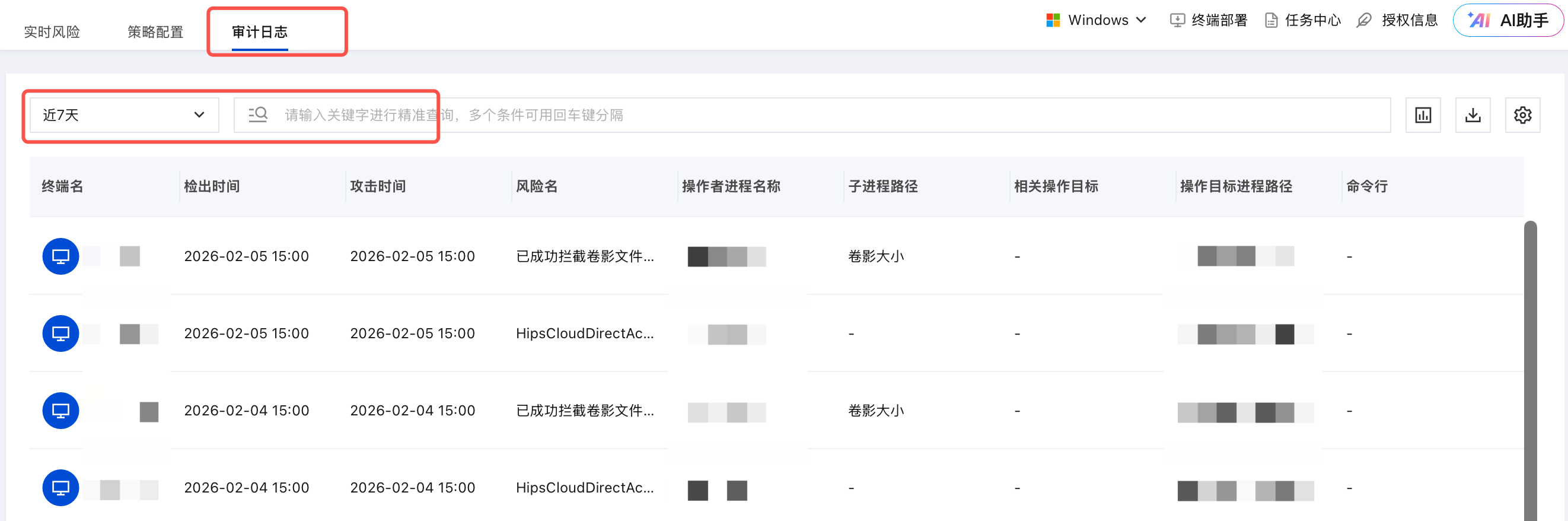 在审计日志页面,展示所有检出实时风险的日志情况,支持按时间以及各字段属性筛选。