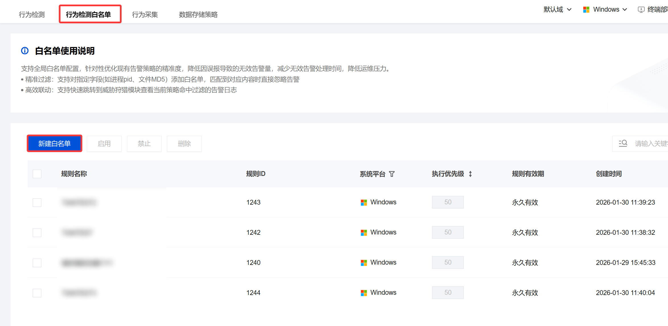 1. 登录 iOA 零信任管理平台控制台,在左侧导航栏,选择终端防入侵 > EDR> 策略规则 > 行为检测白名单。