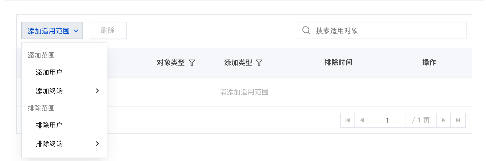 支持按照适用终端、适用用户、例外终端以及例外用户等维度指定策略生效范围,其中终端与账号都支持指定具体的终端名称以及账号名称,同时支持按照组织架构和自定义分组批量勾选。