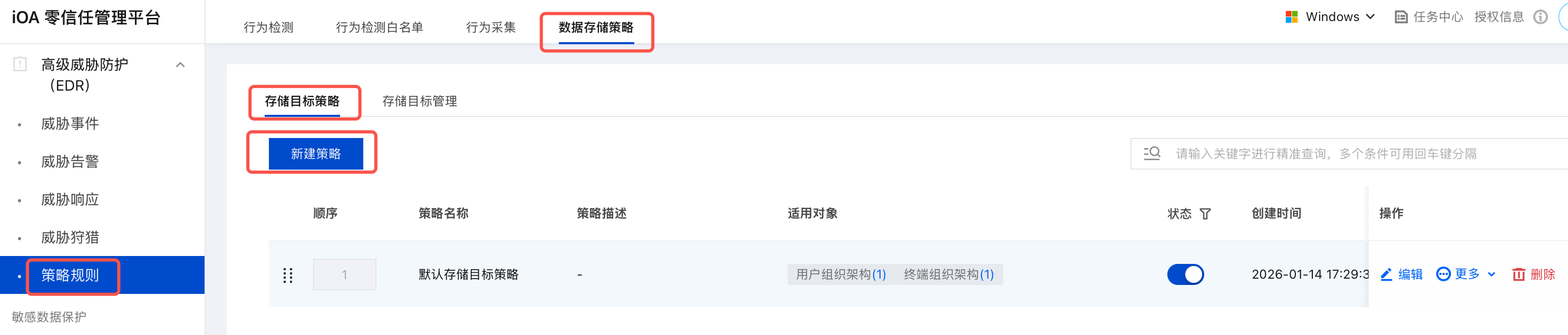1. 登录 iOA 零信任管理平台控制台,在左侧导航栏,选择终端防入侵 > 高级威胁防护(EDR)> 策略规则 > 数据存储策略。