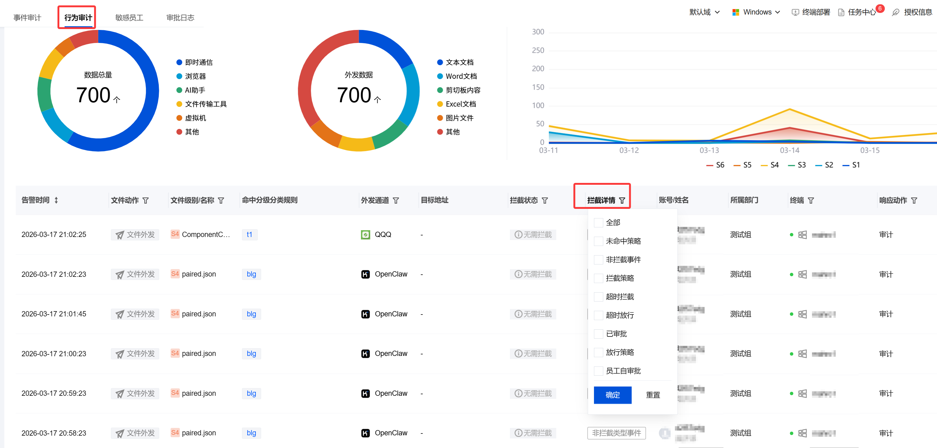 5. 行为审计日志支持展示拦截详情,拦截状态展示更清晰。
