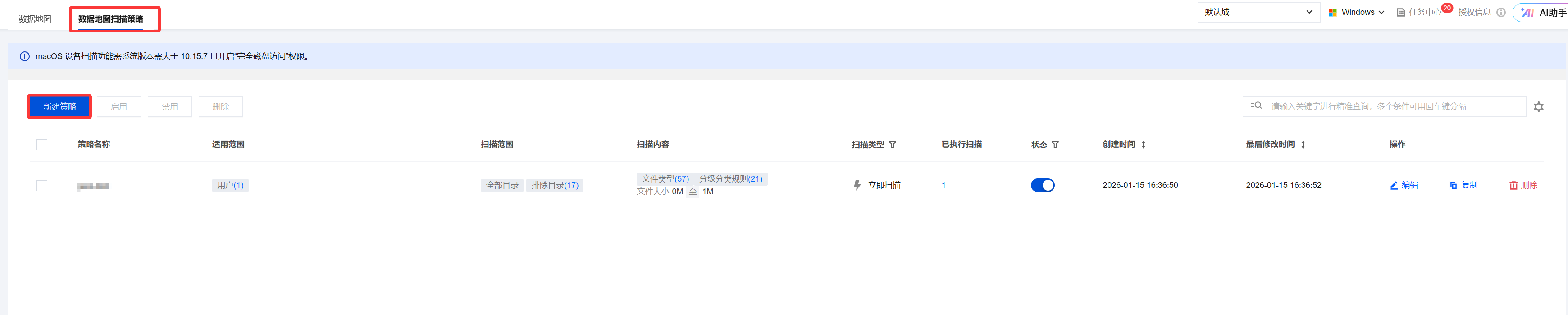 1. 登录 iOA 零信任管理平台控制台,在左侧导航栏,选择数据地图 > 数据地图扫描策略,单击新建策略。