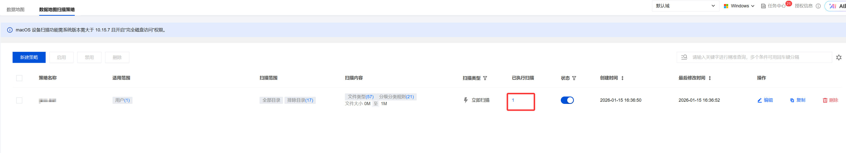 扫描时间 | 立即扫描 | 策略配置完成终端拉取策略后立即扫描电脑磁盘。 |