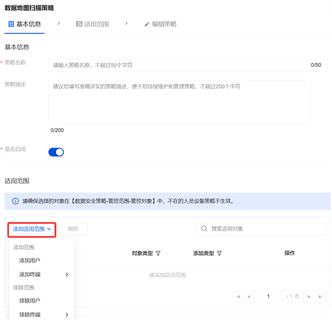2. 在数据地图扫描策略页面,配置相关参数,单击保存。