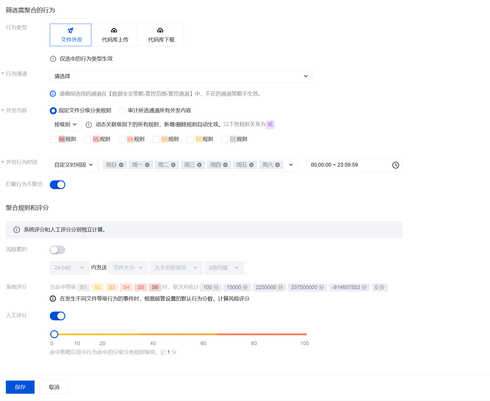行为类型 | 需要告警的操作类型(文件外发/代码库上传/代码库下载) |