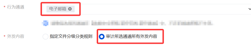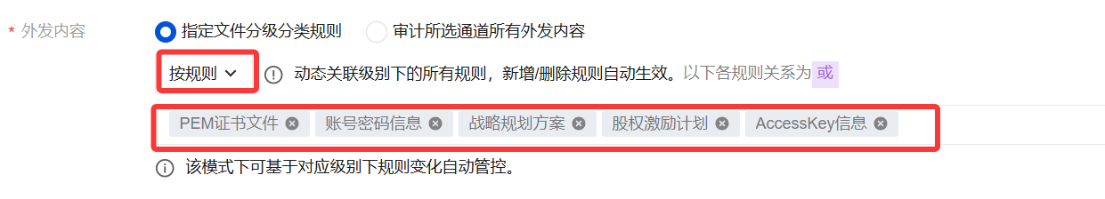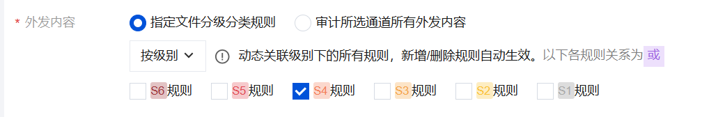 外发内容 | 需要告警的发送内容: 指定文件分级分类规则:选择已定义的分级分类规则作为触发审计的敏感内容。 按级别:管控所选级别下的所有分级分类规则(所选级别下的规则都会被管控),示例:在数据分级分类 > 分级分类规则中新建一个 S4 的规则,此处的按级别会动态关联级别下的所有规则,新增/删除规则自动生效(新建的 S4 规则也会被管控) ![]() 按规则:管控所选级别下的规则(例如:当选择 S4 中的规则,将 S4 中的规则一个个勾选,勾选完后并不是展示 S4 的标签,而是将规则展示出来)示例:在数据分级分类 > 分级分类规则中新建一个 S4 的规则,此处的按规则不会将新建的 S4 的规则罗列进来,只会管控已选择的规则。 ![]() 审计所选通道所有外发内容:在外发通道中配置的通道,都将被审计。示例:配置电子邮箱,则电子邮箱通道相关文件外发都会被审计。 ![]() |