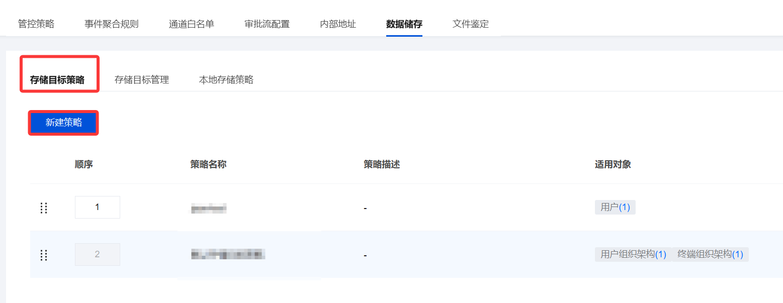 2. 在数据存储页面,选择存储目标策略,单击新建策略。