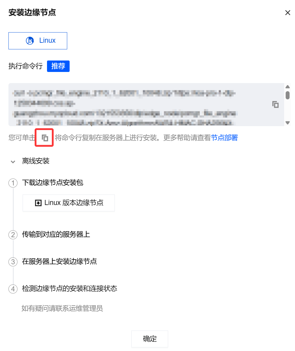 7. 在创建的节点中,单击安装节点,支持将命令行复制到服务器上进行在线安装与离线安装。