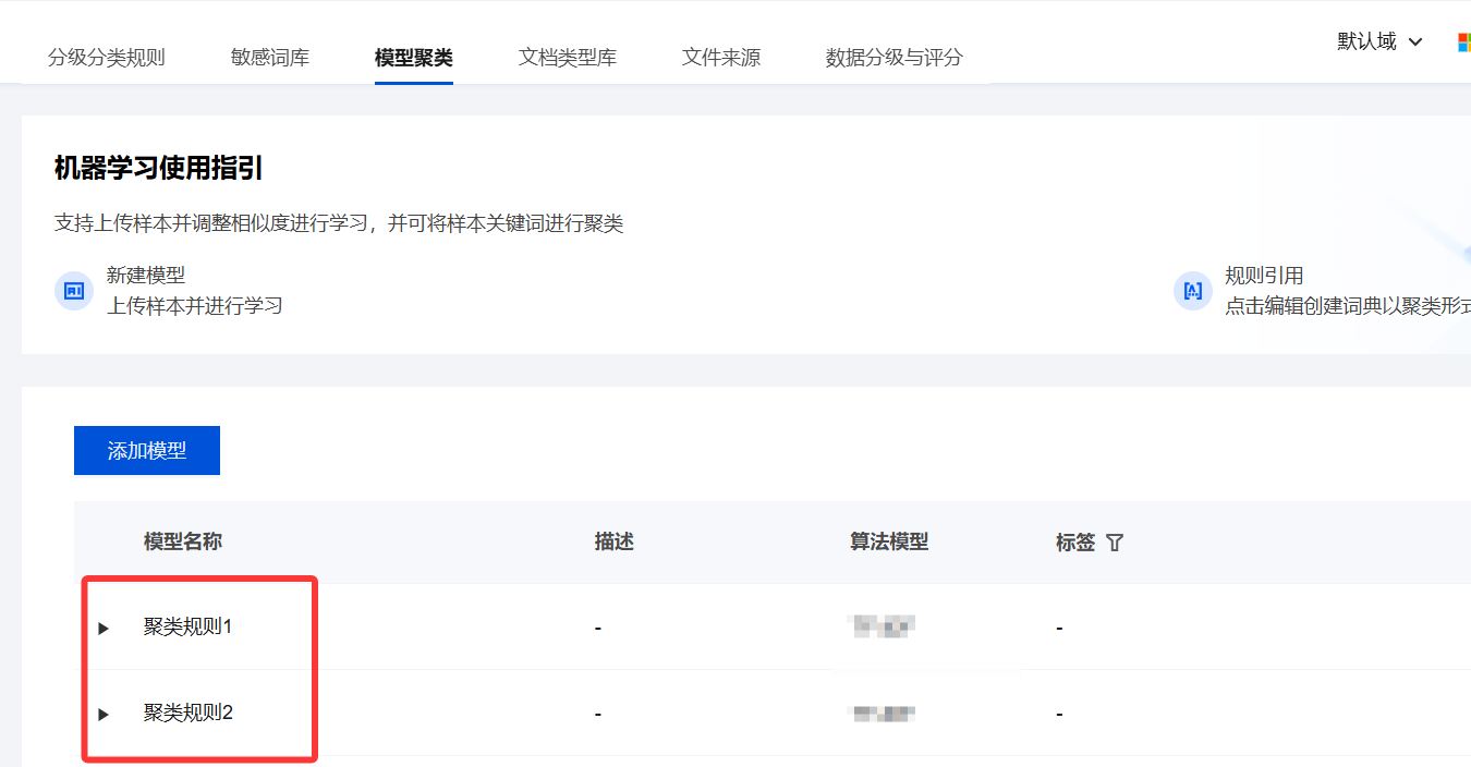1. 登录 iOA 零信任管理平台控制台,在左侧导航栏,选择数据分级分类 > 模型聚类。