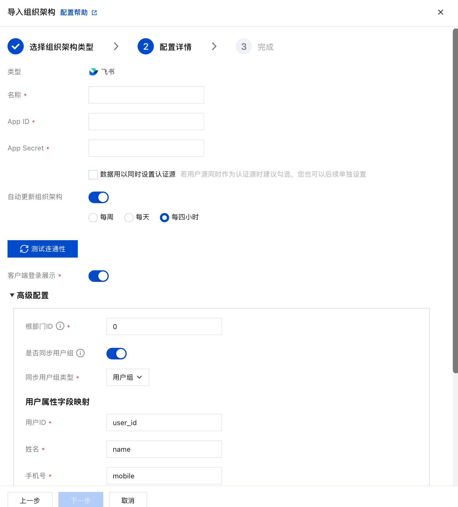 3. 在新增组织架构页面,导入类型选择飞书,单击下一步。
