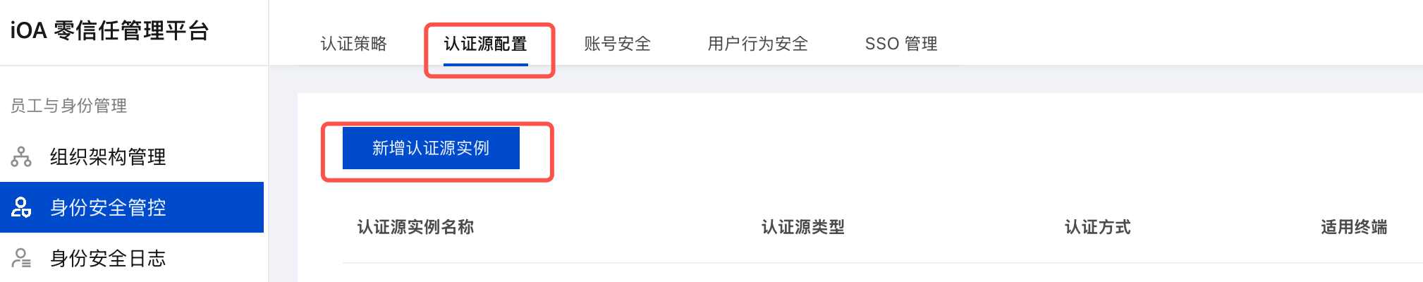 1. 登录 iOA 零信任管理平台控制台,在左侧导览中,单击身份安全管控 > 认证源配置。