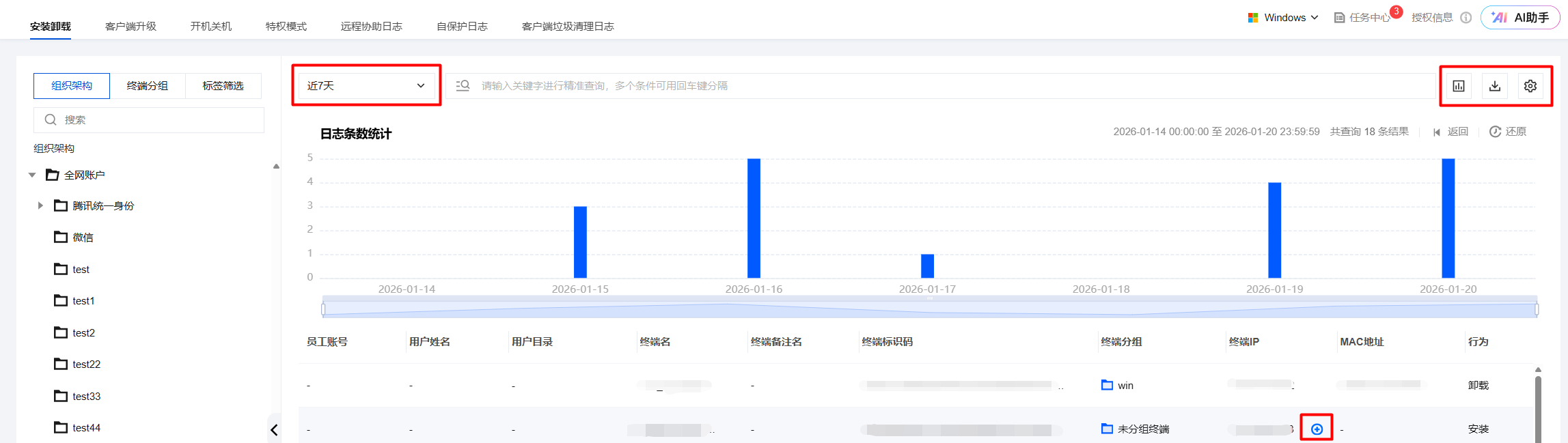 2. 在客户端操作日志页面,支持查看安装卸载、客户端升级、开机关机等日志。