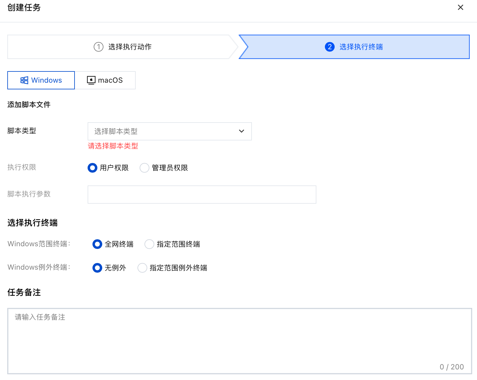 支持同时多选Windows、macOS,每勾选一个系统都需要确认生效范围,默认终端为全网终端,支持例外终端配置。