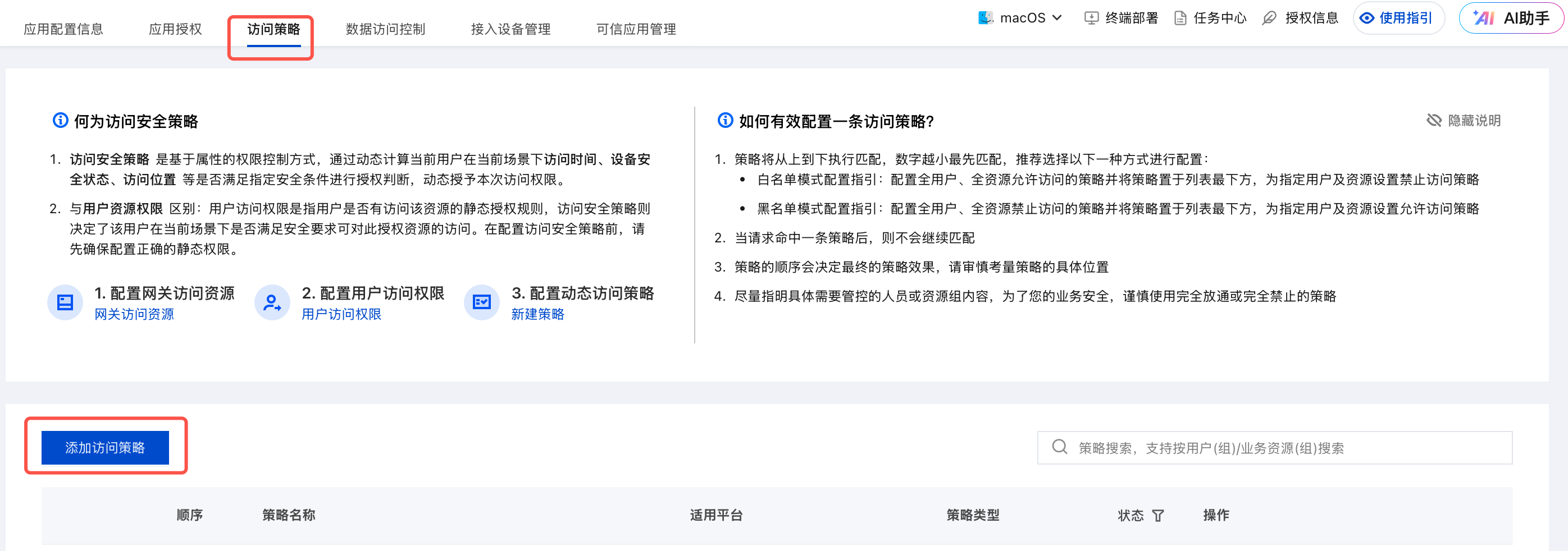 1. 登录 iOA 零信任管理平台控制台,在左侧导航栏,选择应用管理 > 访问策略,单击添加访问策略。